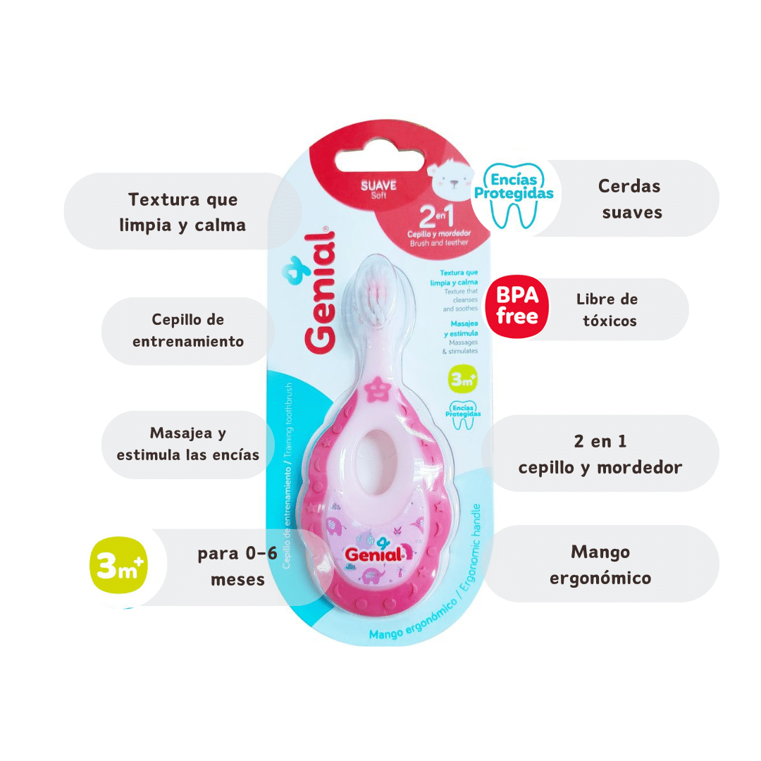 Cepillo dental Genial 2 en 1 con mordedor varios diseños y colores (3m+)